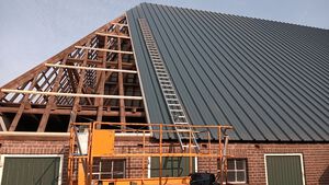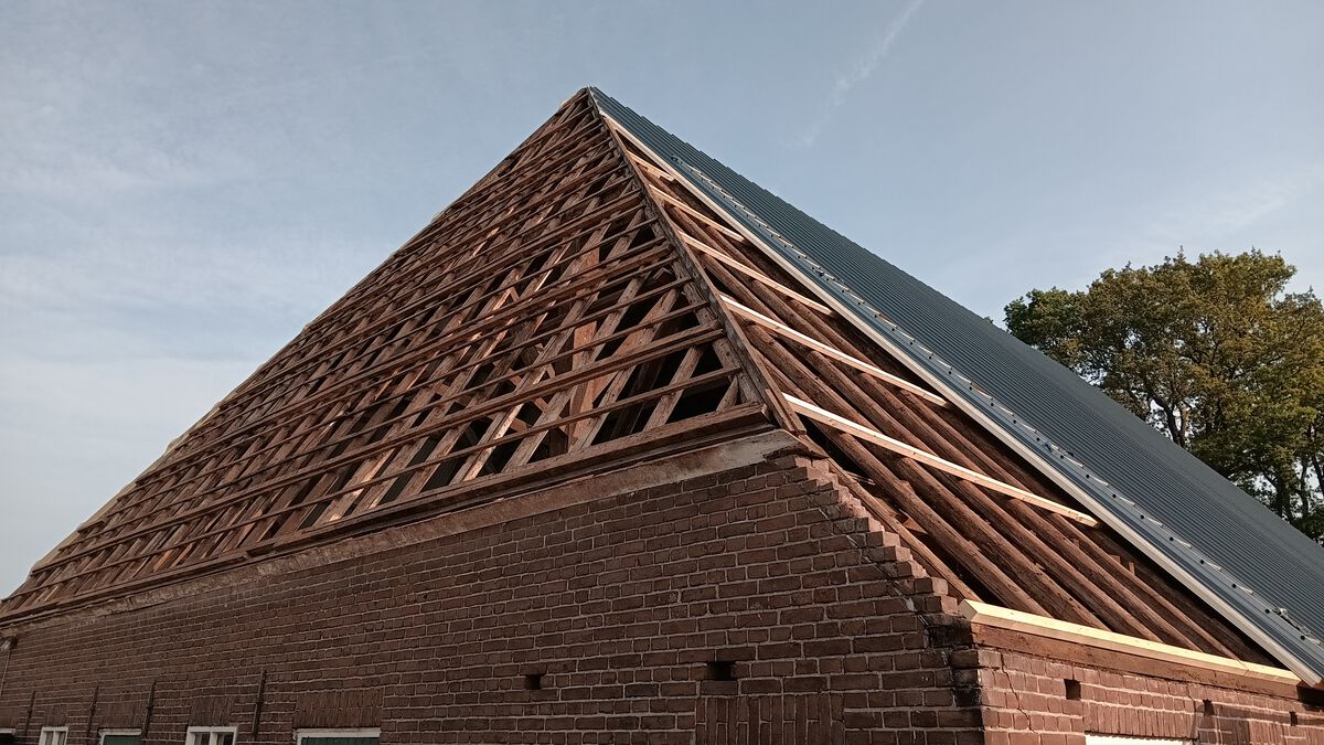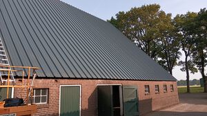 Deze dak was voorzien van dakpannen en een wolfskap van asbest, deze hebben wij laten verwijderen door een asbestverwijderingsbedrijf. Nadat de vrijgave was zijn wij begonnen met het uitlijnen van de gordingen en daarna het dak teruggelegd met een jori-side trapezium dakpaneel meet een kerndikte van 60 mm en in de ral kleur 7016. de binnenzijde van de schuur geeft een mooie "wauw" effect doordat de witte binnenplaat prachtig afsteekt in combinatie met de schitterende gebinten constructie
