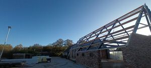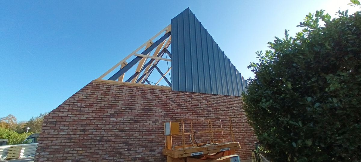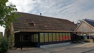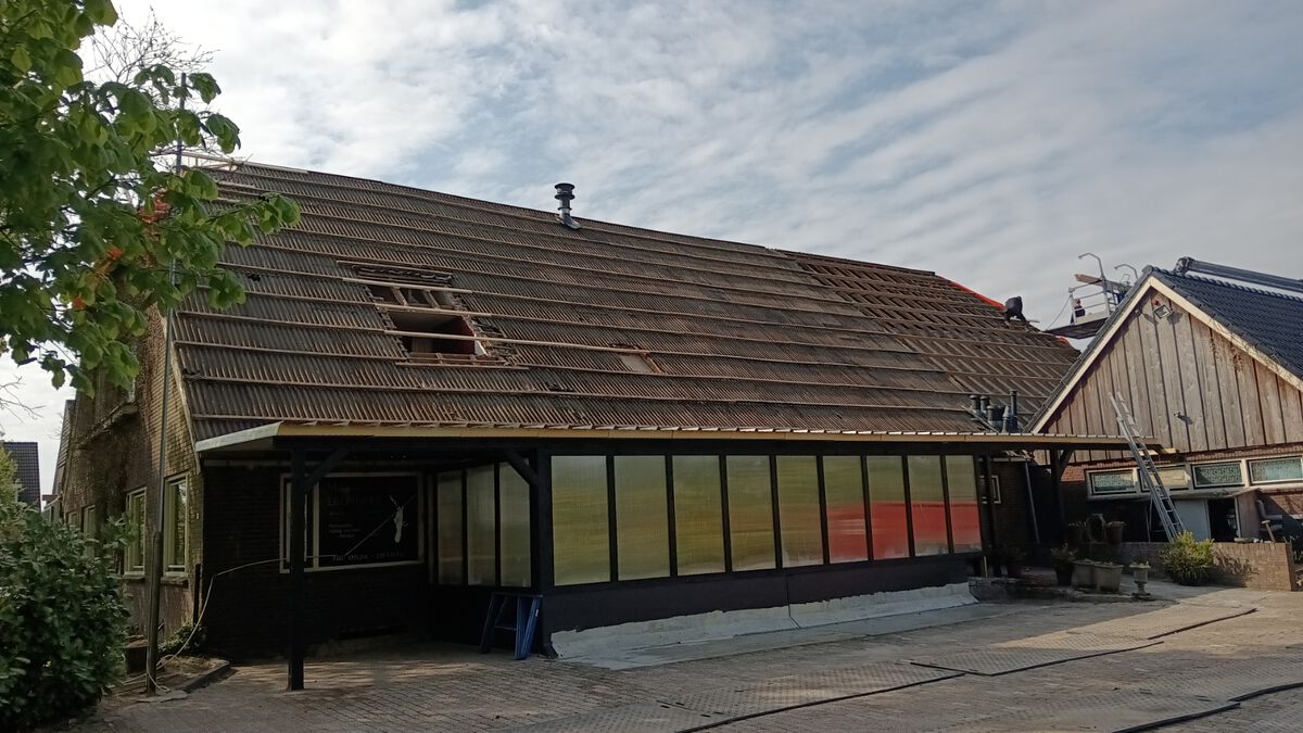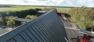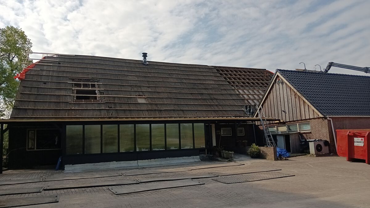 Voor onze opdrachtgever Eroroma in Zwinderen het dak vervangen. Allereerst het asbest laten verwijderen door Flory, na vrijgave het volledige dak uitgelijnd met het benodigde hout. Hierna een trapezium geisoleerde dakplaat ral 7016 met een kerndikte van 100mm weer terug gelegd en afgewerkt met nokstukken en windveren.
