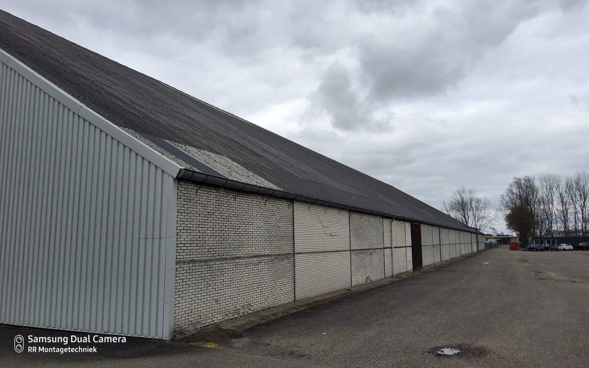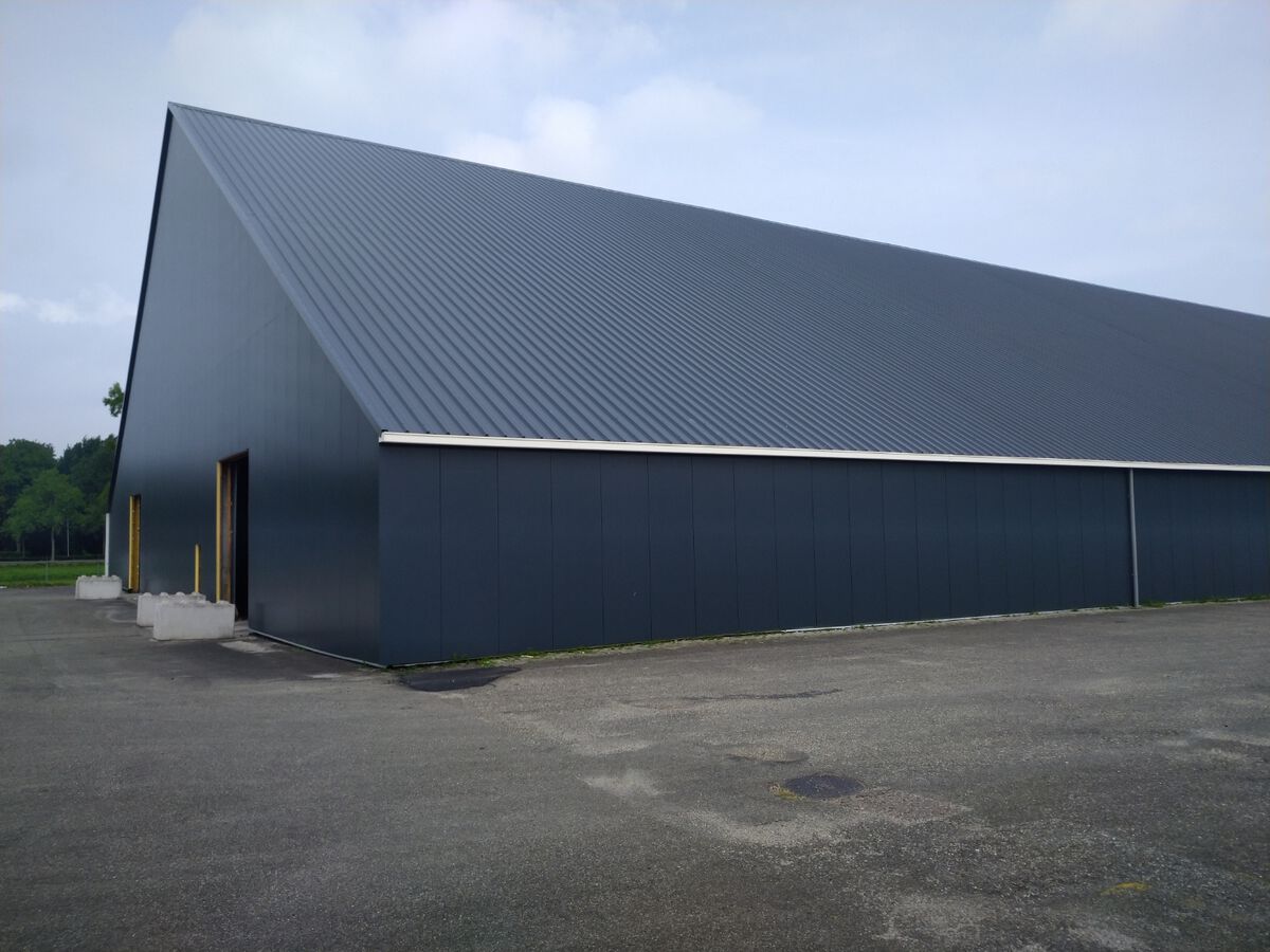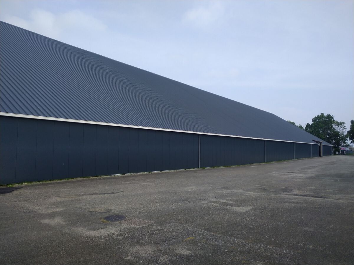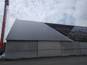 Deze grote hal 120x50 mtr hebben wij ontdaan van de eerste generatie asbestvrije golfplaten circa 6800m2. Daarvoor in de plaats hebben wij een geïsoleerde dakplaat met een kerndikte van 8 cm en een HPS coating 7016 weer teruggelegd. De wanden zijn voorzien van sandwichpanelen met een kerndikte van 8 cm. Om een strakke achtergrond te creëren hebben wij omega's gebruikt die wij hebben uitgelijnd. Tot slot zijn de polyester dakgoten geïnstaleerd met de benodigde afvoeren. Deze afvoeren zijn als strakke afwerking voorzien van zetwerk in hetzelfde materiaal als de wanden. Deze schitterende hal is voor de komende jaren weer helemaal up to date.